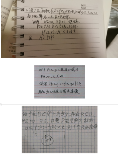 谭老师在课堂上布置讨论任务“怎么用语言描述二元函数的连续性?”,展示同学们有代表性的回复答案,逐一进行分析,指出错误之处,加强对知识点的掌握及二次认识。