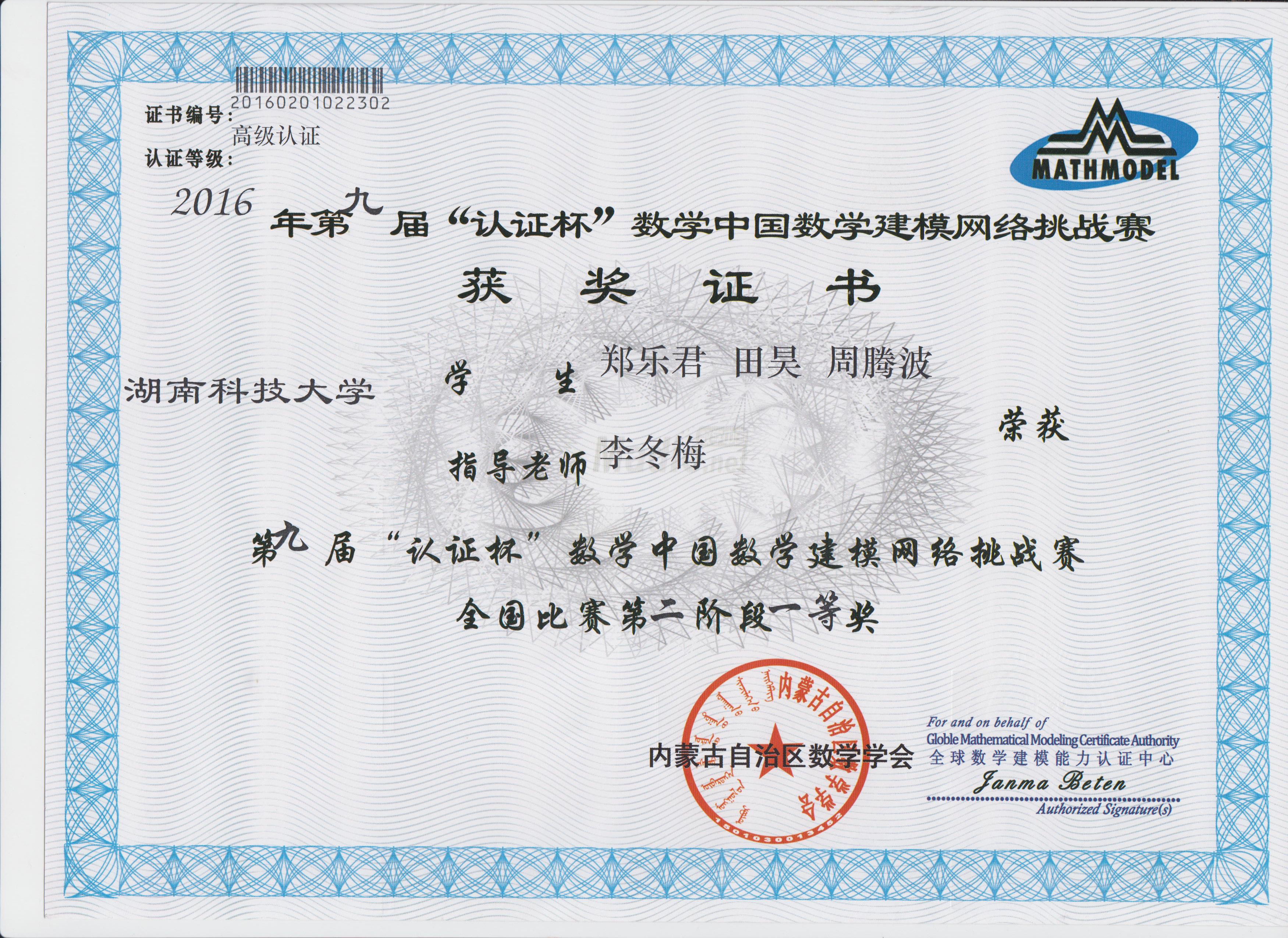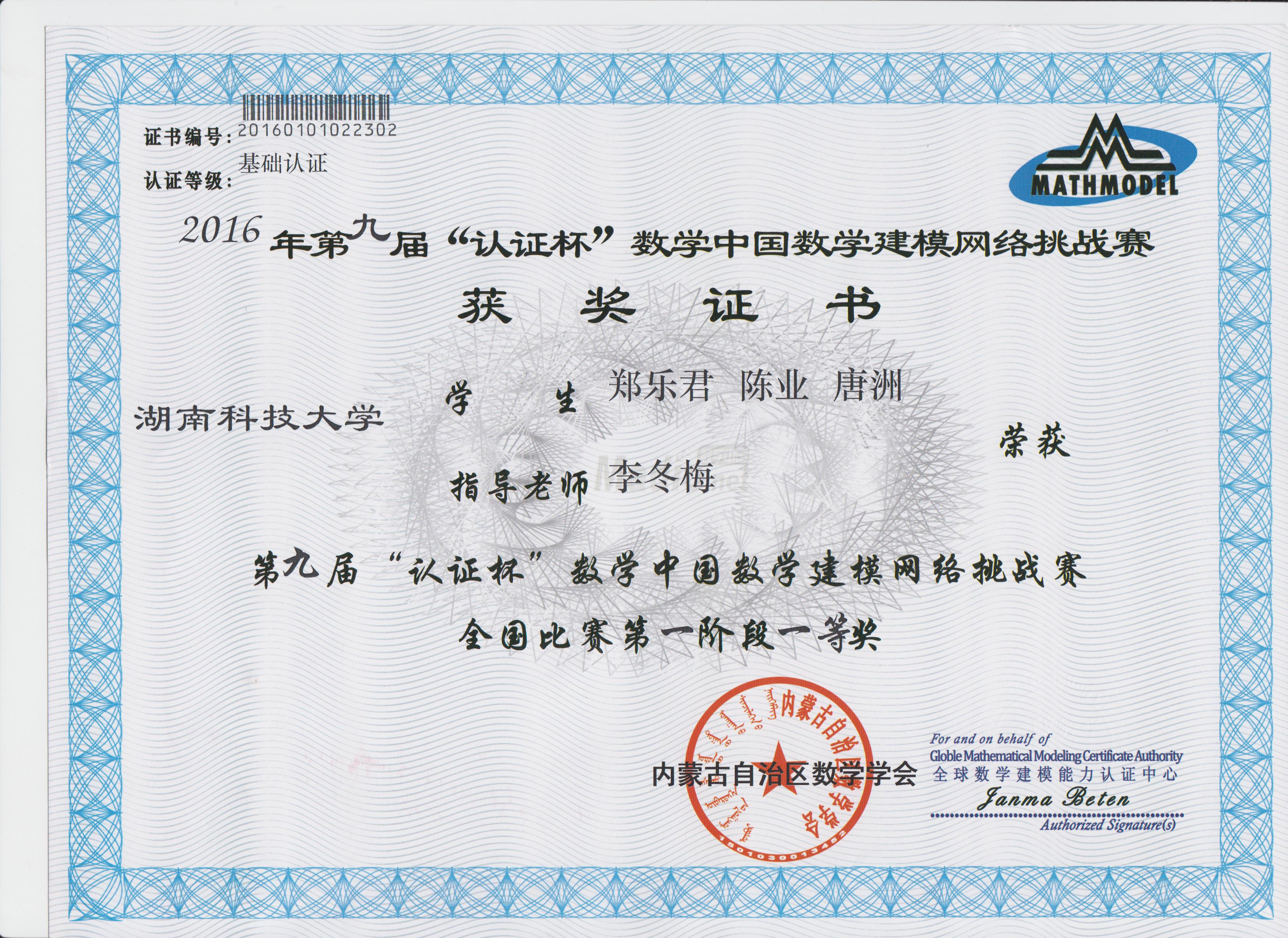 公司荣获第九届认证杯数学中国数学建模网络挑战赛一等奖